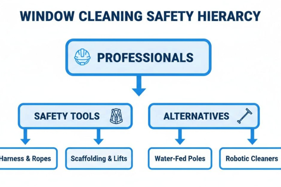 Diagram illustrating the window cleaning safety hierarchy with professional tools and alternative methods.